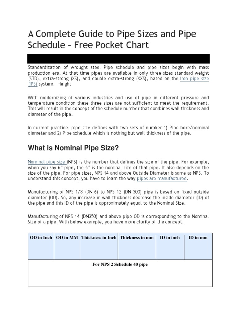 A Complete Guide To Pipe Sizes And Pipe Schedule Free Pocket Chart