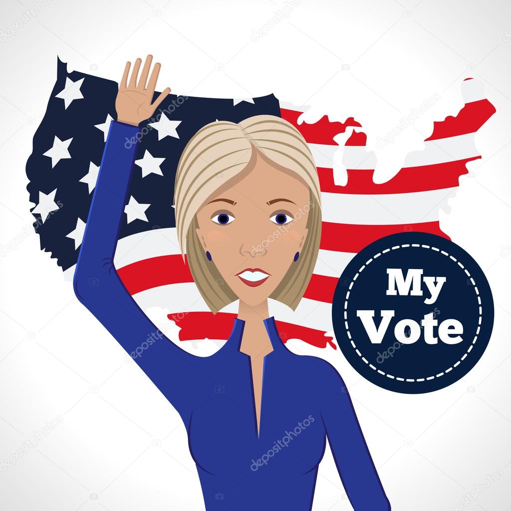 Vector Illustration Of American Election For First Woman Candidate Woman Orator Speech On Usa Election 2016 First Lady President In Blue Suit With Badge My Vote On American Flag Heart Background Premium Vector