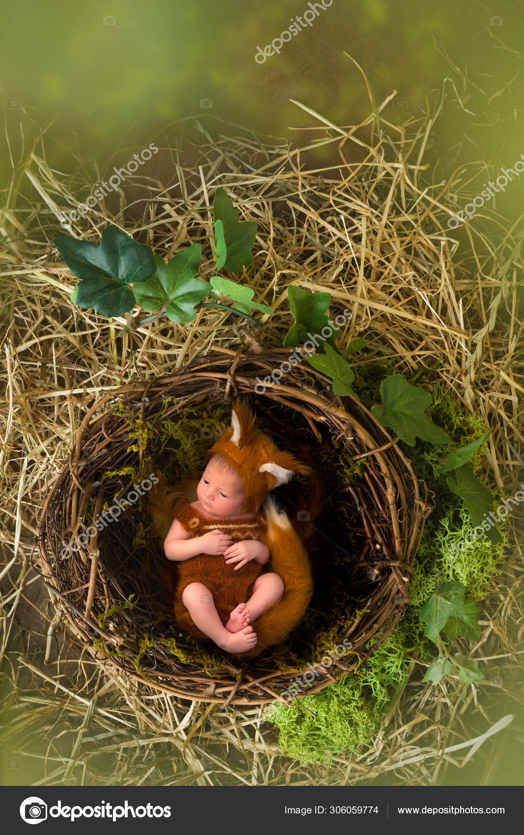 Baby Fox In Hollow Tree Newborn Baby In Fox Outfit Sleeping In A Hollow Tree And Moss