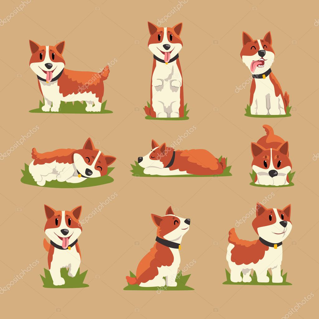 Cartoon Red Haired Corgi Dog Character In Action On Grass Walking Sleeping Standing On Hind Legs Playing Relaxing With Tongue Hanging Out Vector Illustration For Card Book Poster Or Badges Premium Vector