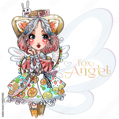 Fox Angel Cute Little Girl With Wings Little Bunny On Hat Beauty Fashion Kids Portrait Anime Cartoon Character Hand Drawn Vector Illustration Buy This Stock Vector And Explore Similar Vectors At