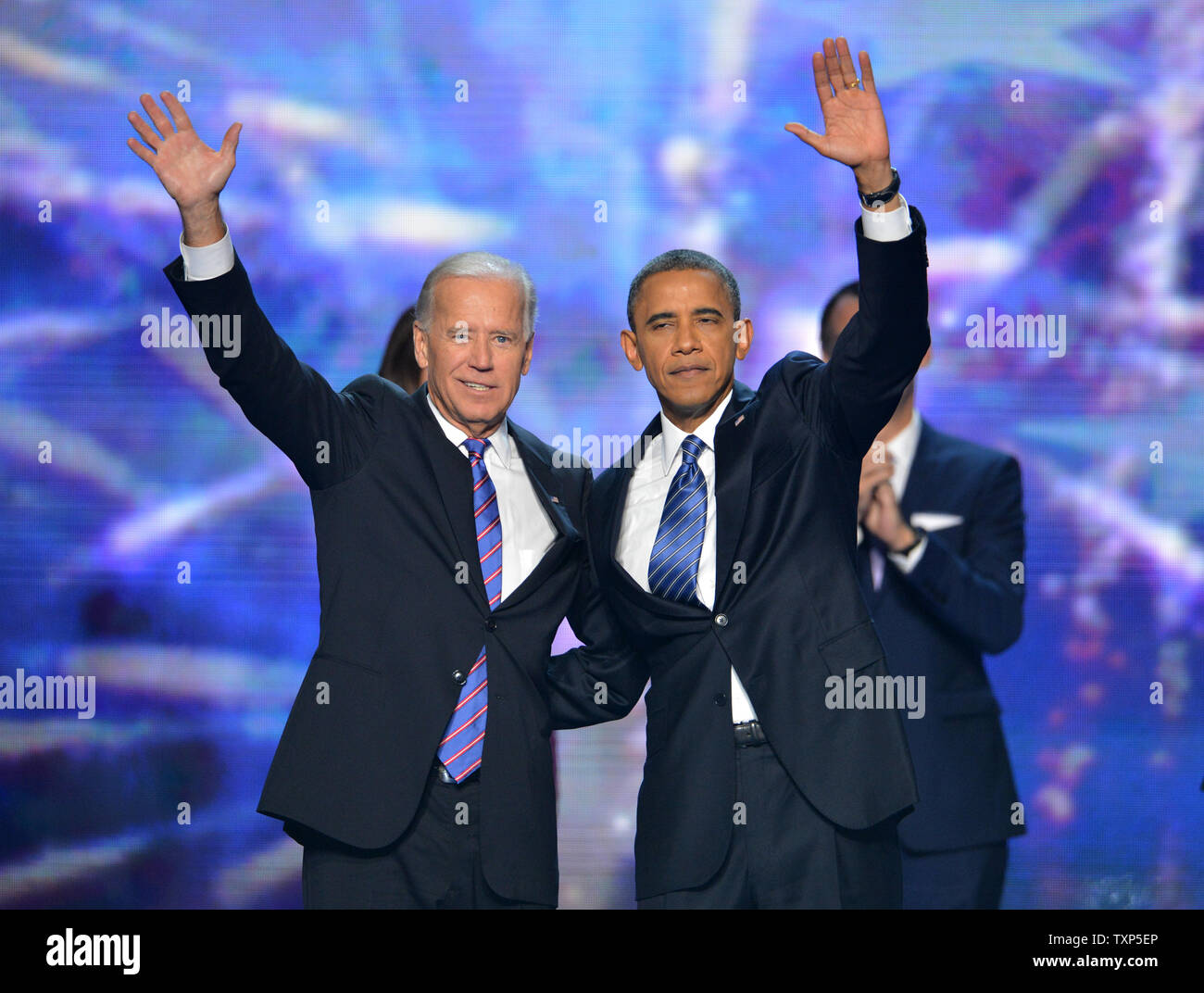 President Barack Obama And Vice President Joe Biden Wave At The 2012 Democratic National Convention At