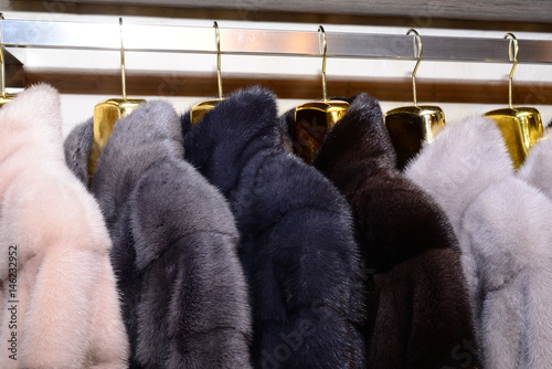 Luxury Mink Coats Grey Brown Pearl Pink Color Fur Coats On Showcase Of Market Best Gift For Women Is Mink Coat Outerwear Buy This Stock Photo And Explore Similar Images At