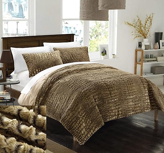 Amazon Com Chic Home Alligator 3 Piece Comforter Set Faux Fur Micro Mink Skin Bedding Queen Taupe Home Kitchen