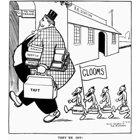 William Howard Taft N 1857 1930 27th President Of The United States Theyre Off Cartoon Showing President Taft Heading To A Railroad Station Followed By Four Small Men Under A Sign Reading Glooms Iden