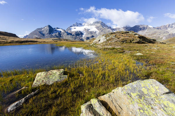 Piz Cambrena Mirrored In The Alpine Lake Val Dal Bugliet Bernina Pass Canton Of Graubunden Engadine Switzerland