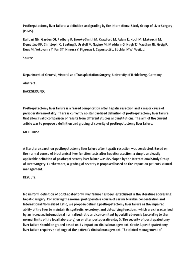 Pdf Posthepatectomy Liver Failure A Definition And Grading By The International Study Group Of Liver Surgery Isgls Christopher Christophi Academia Edu