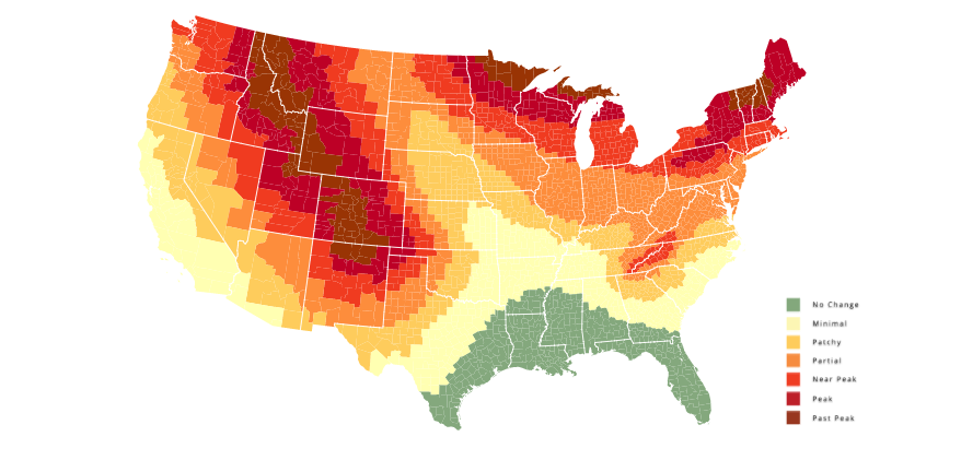 2020 us fall foliage prediction map shows where when leaves are expected to change north east west and parts of mid west states are already showing patchy signs of leaves changing map suggests. In the era of anxiety producing color coded maps from covid 19 case counts to election forecasts the map below is a sight for sore eyes. Color flows through wisconsin from north to south typically starting in mid september and ending in october. The 2020 fall foliage map is the ultimate visual planning guide to the annual progressive changing of the leaves.